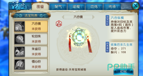 六合镜:在宝库中就可以获取,可以持续的针对目标去造成伤害,可以有效提升我方的攻击力。具有出色的范围性伤害,还能有效提升自身的攻击力。在清理小怪的过程中也有较高的效率,可以针对多个敌人造成对应的伤害,而且还能有效增强自身的输出,是一个相对比较全面的法宝。如果玩家对这一个游戏感兴趣,那也可以去关注一下。