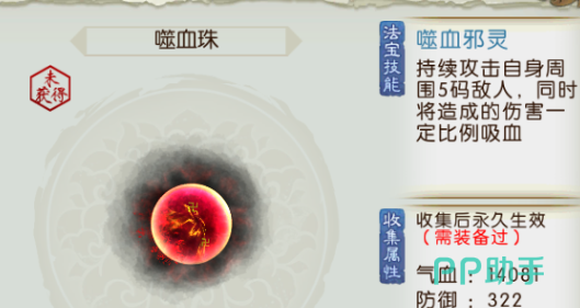 嗜血珠:在活动中就可以获取碎片,然后放到八卦炉中去合成。法宝的技能还是比较出色的,可以持续的攻击自身周围的敌人所造成的伤害,还会按照比例去吸血。在群战的过程中会有明显的作用,可以迅速的提升角色在战斗过程中的输出能力,还有生存能力,这个法宝适合于那些喜欢参与团战的玩家。