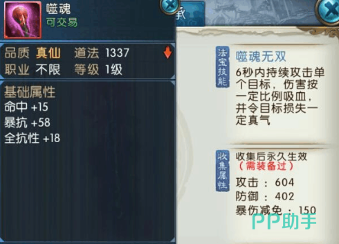 噬魂:这是通过合成而获取,主要的原材料是噬血珠,八卦炉。不过必须要vip13才能够获取这些材料。法宝的技能很出色,在6秒内就可以持续的攻击,单个目标伤害是按照一定比例去吸血,还会让目标去损失真气。主要的优点就在于拥有比较强大的吸血能力,可以更快的增强角色续航。在战斗的过程中就可以保持较好的生存状态,而且还可以消耗敌人的真气,这也是一个得力的法宝。