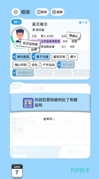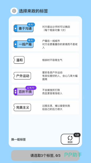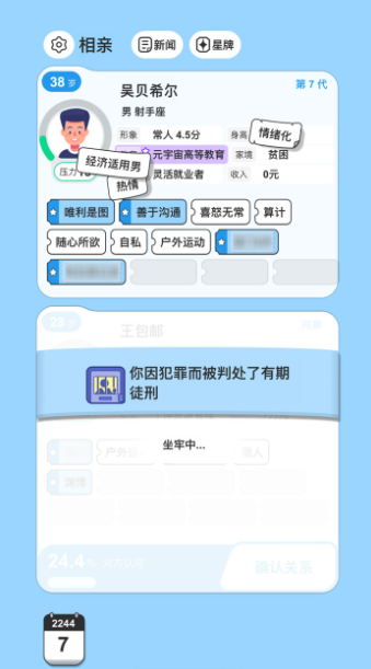 在正式开始游戏之前,小伙伴们需要先为自己设定一个全新的身份,从性别到年龄到性格,全部可以自由决定,你甚至可以选择自己喜欢的外貌。在这一切全部都设定好之后,小伙伴们就可以进入游戏并且开始相亲了,而你在相亲市场上所遇到的对象,各项属性也是完全随机的,小伙伴们需要从茫茫人海中,挑选出自己认为最匹配的一个,并且与他开展人生的下一阶段。