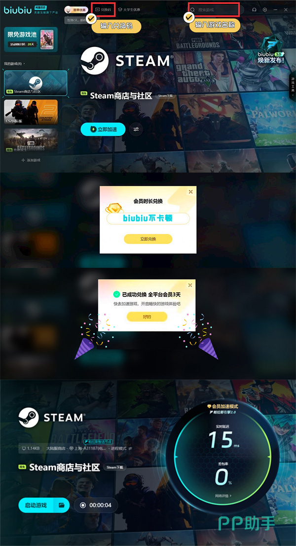 对于一些希望能解锁更多加速机会的朋友而言,更是能主动去点击界面中的兑换按钮,然后借助【biubiu不卡顿】,就可在平台中领取到72h加速时长了,值得一提的是,目前biubiu针对部分休闲类的游戏,更是开放了限免加速机会哦,也就是说大家到时即便不去充值,也能去免费体验感受它带来的强大性能。