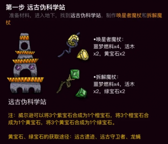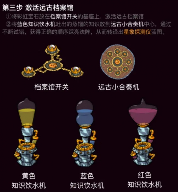 到了远古伪科学站把唤星者魔杖和拆解魔杖制作好以后,在月圆的夜晚,把制作好的魔杖插到月台上面,呆一晚以后就能获得彩虹石,用彩虹石把远古档案馆激活就能获得星象探测仪的蓝图了。