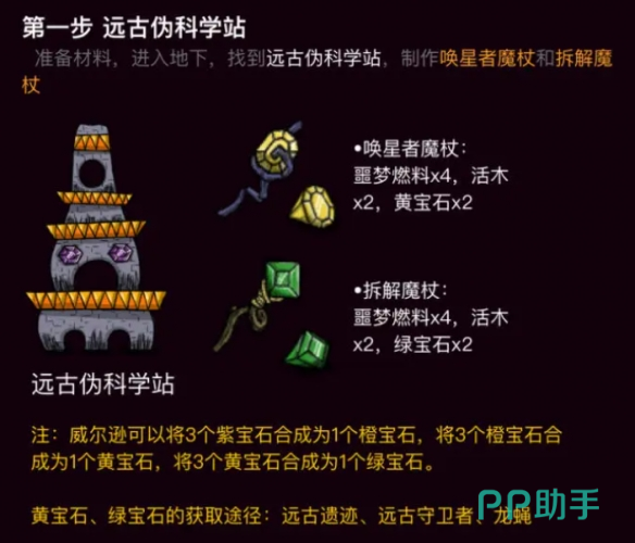 星象探测仪蓝图需要玩家在远古伪科学站获得,在前往远古伪科学站之前,玩家西药把制作唤星者魔杖和拆解魔杖的材料准备好,唤星者魔杖需要使用4个噩梦燃料、2个活木、2个黄宝石,拆解魔杖需要用到4个噩梦燃料、2个活木以及2个绿宝石。