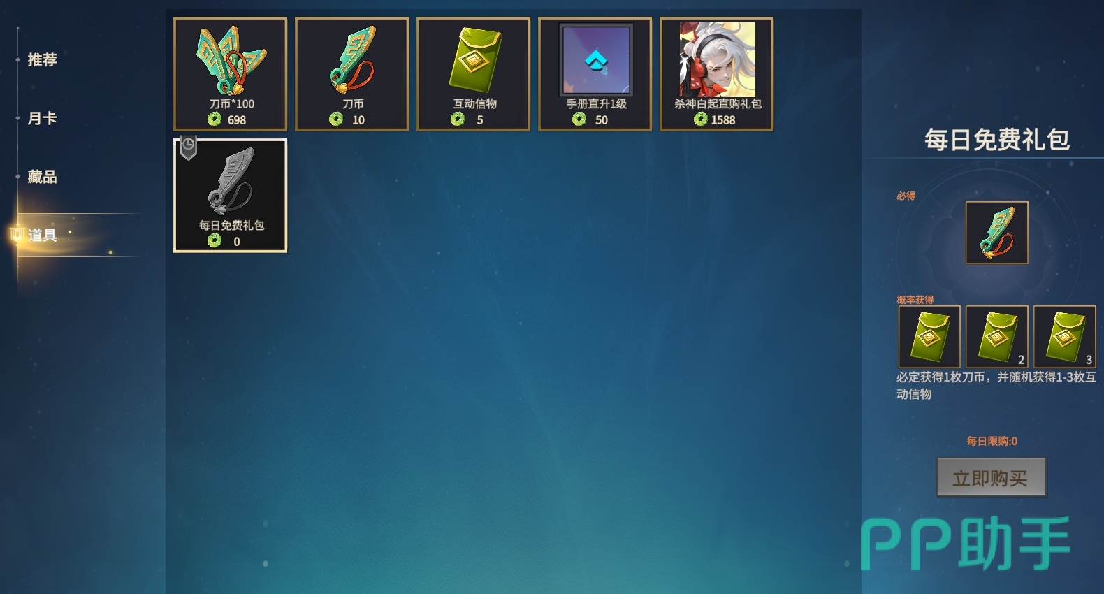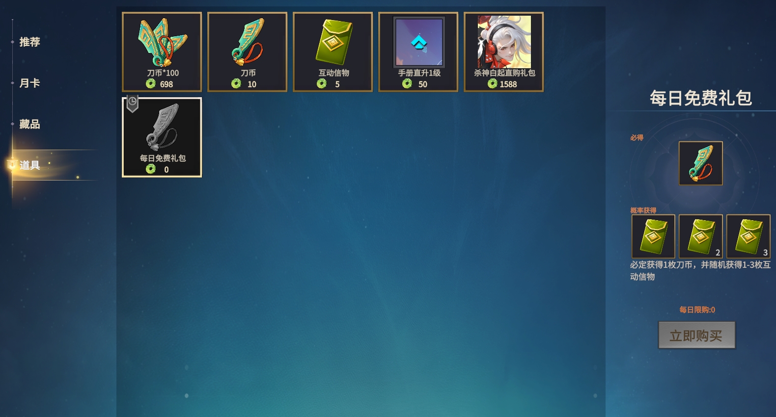 “月卡”板块提供两种订阅选项:定价68元与30元的月度通行证。购入后立即发放玉壁(游戏内充值货币)及刀币(用于收藏卡抽取),并解锁连续30天每日登录领取刀币的权益。该设计兼顾短期资源补充与长期积累效率,适合有稳定活跃习惯的玩家。“藏品”区域则聚焦于高完成度外观资产,如限定皮肤、动态特效包及稀有弈灵形象,全部需使用玉壁直接购置,无概率机制,所见即所得。“道具”栏为功能性资源兑换中心,支持玉壁兑换刀币、购买互动信物、升级通行证手册,以及选购各类直购礼包;另设免费领取入口,每日重置次数,建议养成定时领取习惯以最大化资源收益。