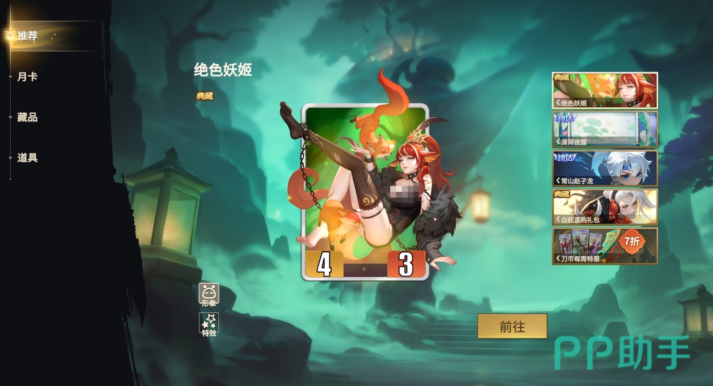 游戏商城划分为四大功能板块:推荐、月卡、藏品与道具。其中“推荐”栏集中展示当期限时上架的视觉类内容,包括部将皮肤、牌桌皮肤及弈灵形象等。所有商品均以独立建模、专属动作序列与动态特效呈现,显著提升角色表现力与桌面沉浸感。点击对应商品旁的“前往”按钮,可一键跳转至购买页或指定卡池进行抽取。需特别说明的是,此类外观道具不附加任何属性加成,不影响统帅能力、部将战力或牌局策略逻辑,完全遵循“纯装饰”原则,确保竞技环境零干扰。
