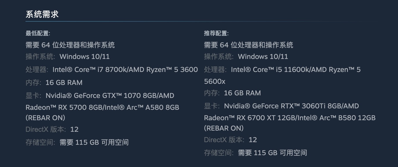 除了显卡和处理器,游戏还对内存、操作系统和存储有着明确要求。16GB的内存、Windows 10/11操作系统以及SSD固态硬盘都是不可或缺的。