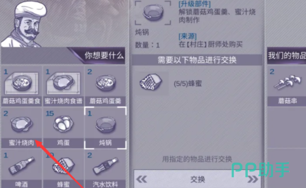 在《阿瑞斯病毒2》这款游戏中,想要制作出蜜汁烤肉这道美食,玩家需要先获得炖锅,这个是制作美食的基本工具。炖锅的获取方法是在村庄厨师那里用蜂蜜去交换。一个炖锅需要5个蜂蜜去兑换,玩家获得炖锅后在厨房进行升级解锁更多食谱。