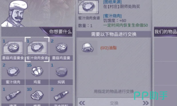 接下来制作蜜汁烤肉的食谱需要用2个油脂在厨师那里兑换。玩家可以在森林中猎捕箭猪来获得油脂。玩家也用5块生肉跟厨师直接获取2份秘汁烤肉。但是生肉在游戏中是比较宝贵的资源,建议大家节约使用。