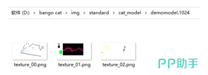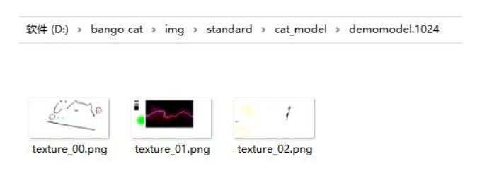 点击进入“打开素材文件夹”后,你会进入到一个文件夹路径,通常是这样的路径:“D:/BongoCat/img/standard/cat_model/demo/model.1024”。这个路径就是我们要修改的地方。你可以看到Bongo的默认皮肤文件就在这里。