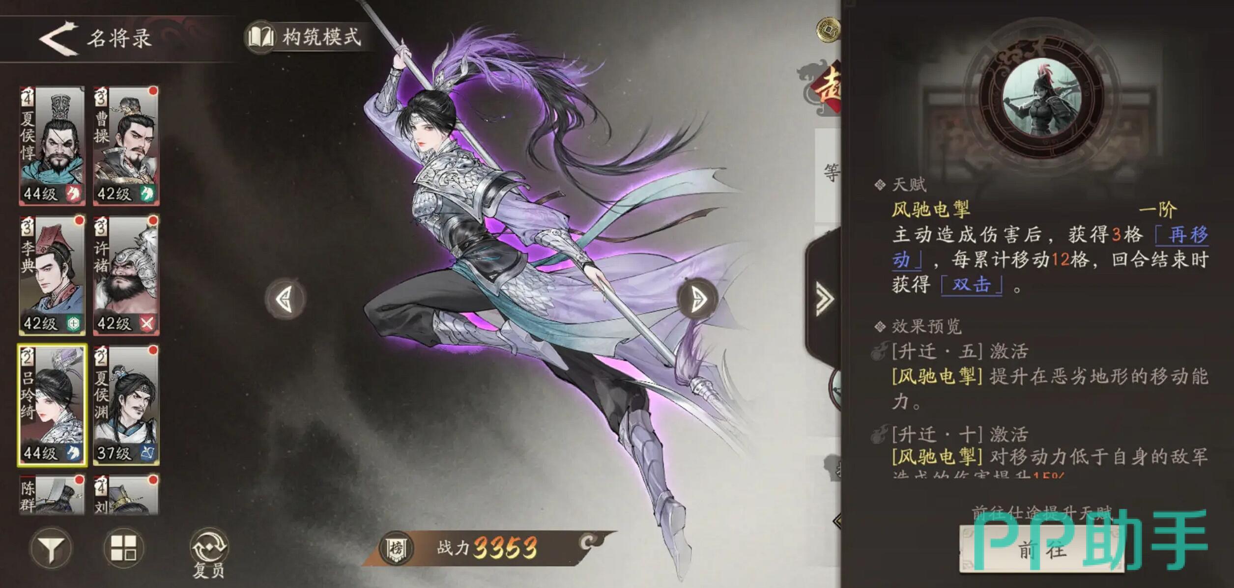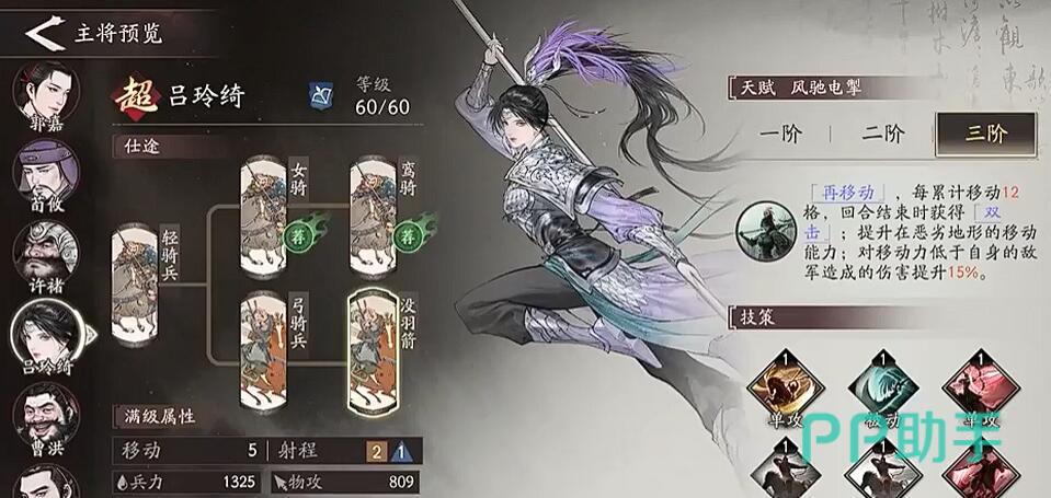 吕玲绮的核心在于“移动即输出”,其定位为骑兵中的突击型单位,首充6米即可获得。她每回合移动越多,伤害叠加越显著,从游戏前期到后期都能持续发挥作用。天赋方面,核心技能“风驰电掣”可在主动攻击后额外移动3格,单回合累计移动达12格时,回合结束触发双击效果——下一次普攻虽降低80%基础伤害,但会追加相当于100%输出的真实附加伤害。二阶天赋提升在恶劣地形的通行能力,三阶则对移速较慢的目标造成额外15%伤害。特别提醒:切勿将其当作站桩输出使用,骑兵路线提供+1移动力和60物攻加成,远优于弓兵线。