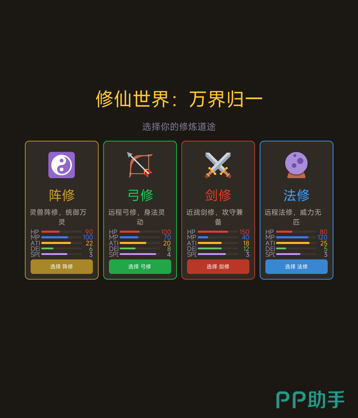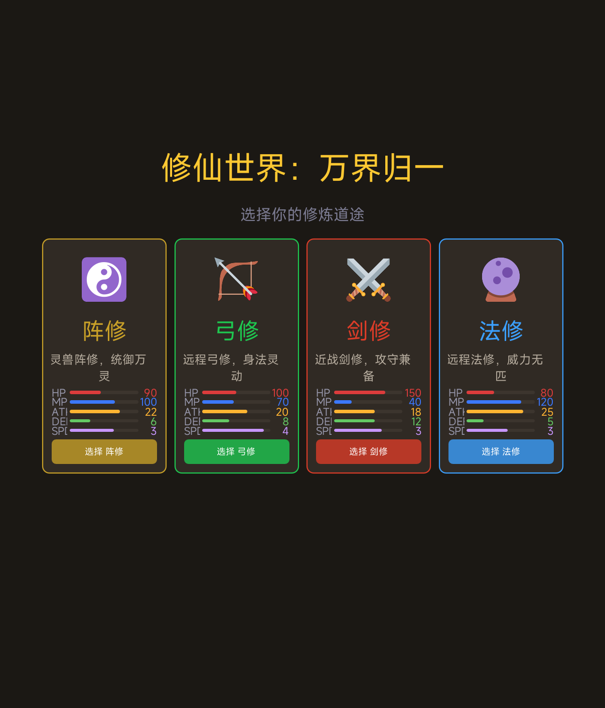 游戏主界面采用模块化布局,功能分区明确。开局即从四大职业中选定其一:法修主控元素术法,剑修专注近身斩击,弓修擅长远距离狙杀,阵修则以布阵控场为核心。选定后立即进入地图,全程无需手动操控角色移动或释放技能。