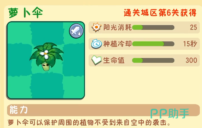 萝卜伞是一种功能性较强的支援植物,自身几乎不参与战斗。只需花费25点阳光即可种下,冷却周期为15秒,拥有300点常规血量。它的独特之处在于能够为邻近植物提供防护,使其免受空中单位的袭击。鉴于新版加入了多种飞行类僵尸,且多数植物无法对空反击,因此在面对空袭关卡时,萝卜伞显得尤为关键。