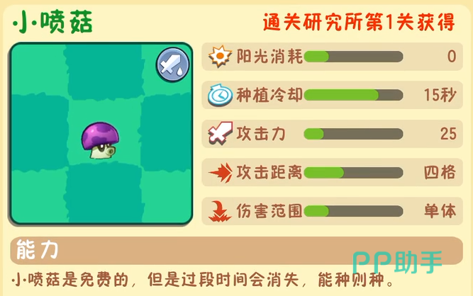 小喷菇是广受玩家喜爱的应急植物之一,在关键时刻常能扭转局势。它最大的优势是无需阳光即可种植,适合资源紧张时快速补位。不过存在时间较短,会在一段时间后自动消失。冷却时间为15秒,基础攻击力为25点,属于中等输出水平。