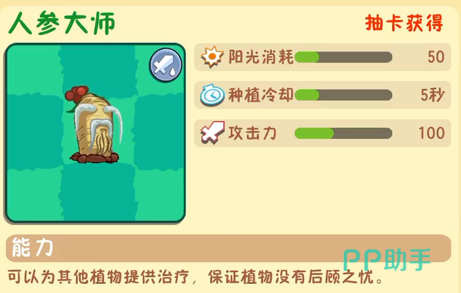 第二位介绍的是人参,这是本次更新中加入的新植物。在最近一次测试调整中,人参的表现机制发生了重要变化。虽然依旧需要50点阳光来部署,冷却时间缩短至5秒,最关键的是现在具备了100点攻击力,而此前版本中它是完全无攻击能力的。该植物定位为辅助支援类,核心功能是治疗周围植物,但作用范围有限,因此布阵时需合理规划位置以发挥最大效益。