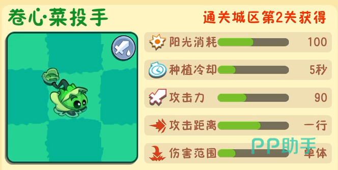 卷心菜投手作为系列经典角色再度回归,造型更加卡通化。部署成本为100点阳光,种植后仅需5秒即可再次使用。虽然单次伤害不高,但能远程打击同一行的敌方目标。当完成进阶升级后,可额外附加火焰灼烧效果,使其在前期远程火力配置中占据一席之地。