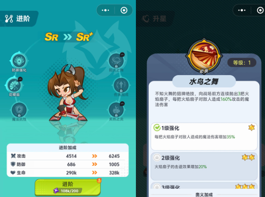 不知火舞定位为后排法术输出核心。全部技能与天赋设计均围绕极致爆发展开:每次扇子投掷造成160%魔法伤害,高频释放形成持续压制;奥义技能可提升扇子投掷数量,实现输出倍增。该角色对精英单位与群体目标均具备高效清场能力,操作门槛低,但输出转化率极高,是站桩输出体系中不可替代的主力C位。
