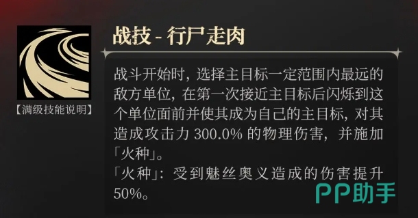 在用这个角色的时候,大家可以在战斗开始后直接使用她释放战技,战技的效果是选择主目标一定范围内最远的敌方单位作为目标,在第1次接近主目标后,她能够利用闪烁技能瞬间移动到这个单位面前,并使其成为自己的新主目标,这一过程中,她不仅能对敌人造成300%的物理伤害,还能施加火种状态,这个火种状态是专门对自身生效的,带有火种的目标在受到魅丝的奥义技能时都会提高所造成的伤害,提升了魅丝的输出能力。