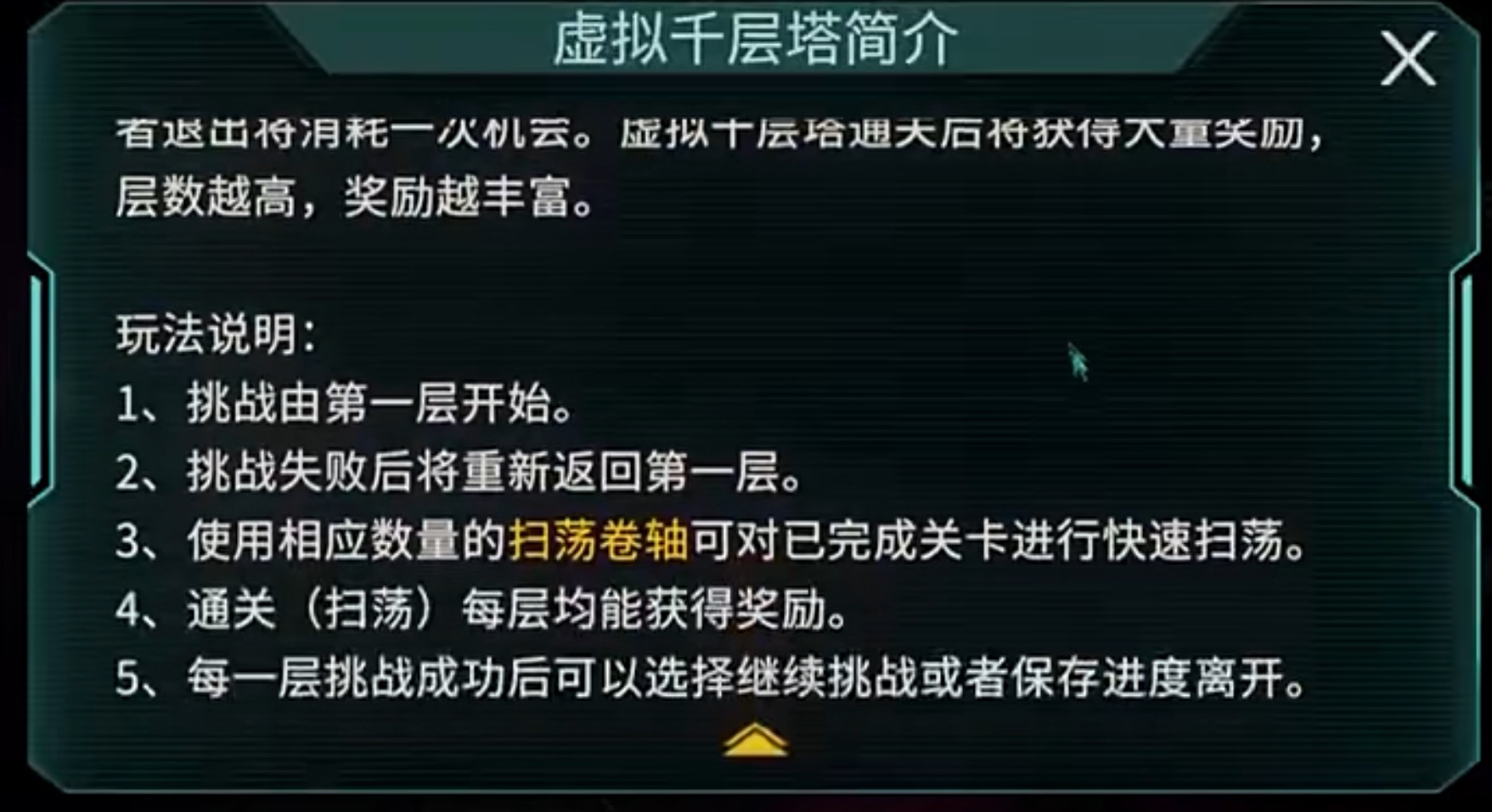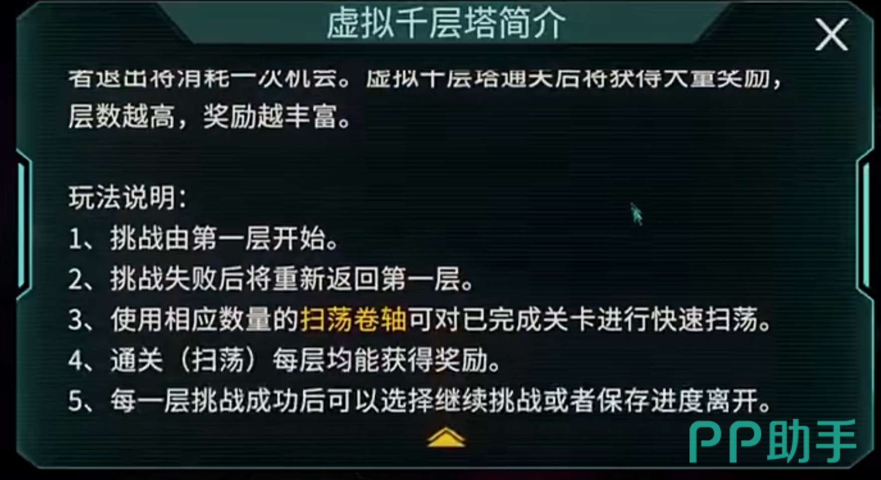 千层塔采用线性递进式结构,共设千层关卡,每层均为独立BOSS战。其核心规则如下:1. 挑战必须从第一层起始;2. 单次挑战中任意一层失败,进度清零,需重新从第一层开始;3. 已通关层数支持使用扫荡卷轴进行一键扫荡,节省重复操作时间;4. 每层通关后即时发放对应奖励,含强化材料、稀有装备碎片及金币等;5. 每层胜利后可自主选择继续向上挑战,或保存当前最高通关层数并离场。