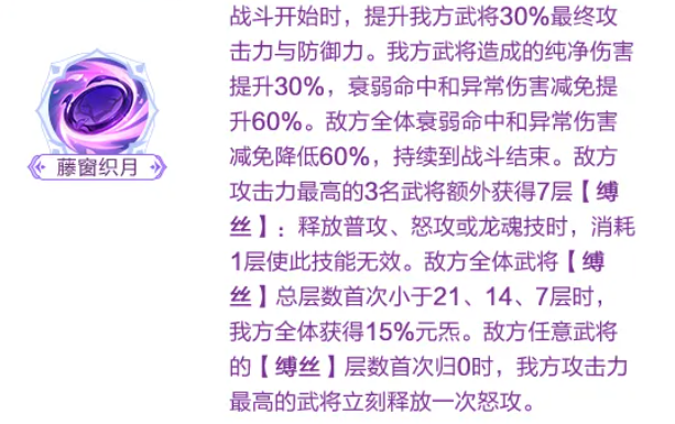 蔓烟绣灵的出战技能名为“藤窗织月”,可在战斗初始阶段为全体我方武将提供三项关键加成:最终攻击力提升30%、最终防御力提升30%、纯净伤害增幅30%;同时使我方衰弱命中率与异常伤害减免能力同步提升60%,并压制敌方全体对应属性,降低其衰弱抵抗与异常抗性达60%,该效果全程持续至战斗终结。