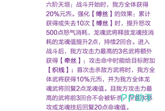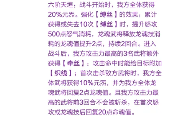 进入战斗后,我方攻击力前三的武将自动获得“牵线”状态;其每次攻击命中均会为目标附加“织线”效果;若我方成功达成首杀,全体武将将获得10%元炁,且所有龙魂系武将额外恢复2点龙魂值;此外,我方攻击最高者在前3回合内免疫斩杀效果,并在其首次释放怒攻或龙魂技后,立即回复20点命魂值。