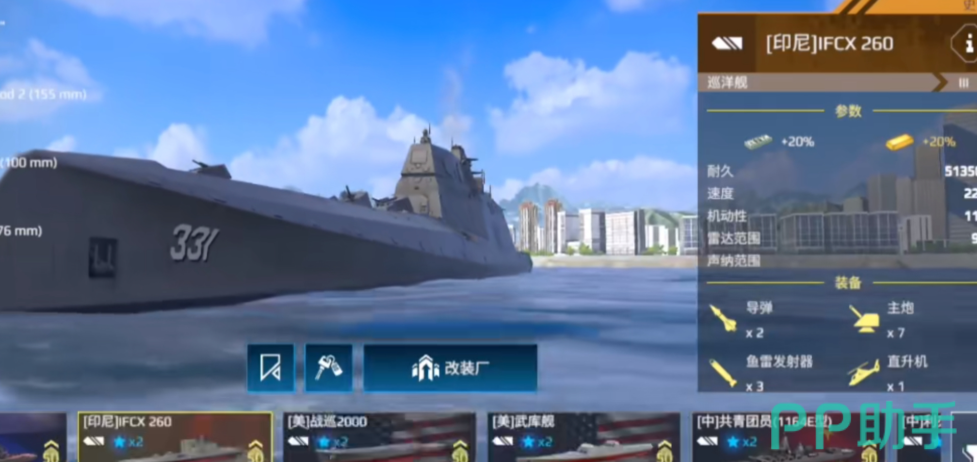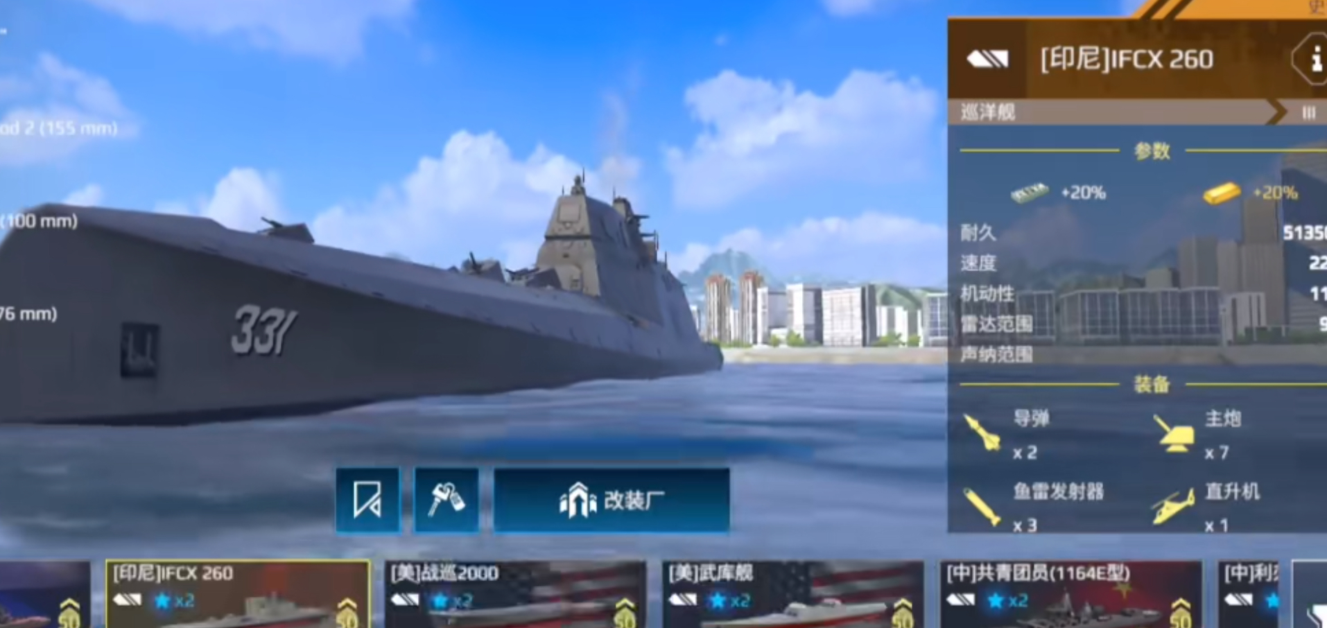 IFCX260是一艘由印度尼西亚计划建造的多用隐身巡洋舰,根据官方数据显示,IFCX260的耐久值为395000,速度为17.5节,机动性8.5,雷达范围8千米,声纳范围1.67千米。当然这不是满级状态,大家可以通过升级的方式来增加战舰的耐久值,速度及各项属性值。从基础属性值来看,机动性不算太强,加上这艘舰船本身船体较长,所以很难完成近距离攻击战,比较适合进行远程输出。
