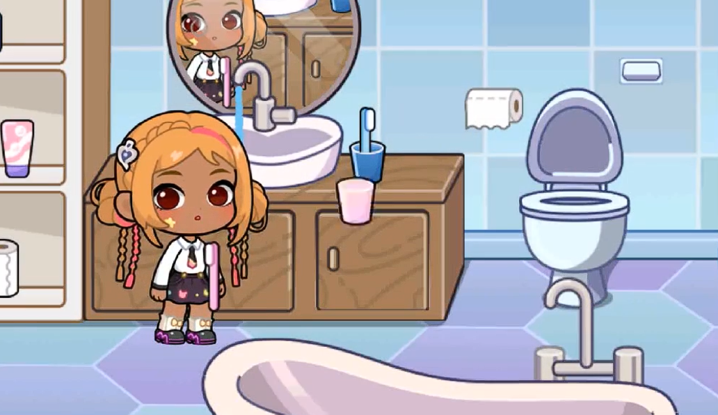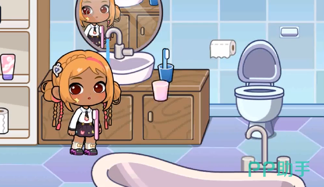 完成换装后,进入晨间洗漱流程。进入卫生间场景,点击牙刷道具并指向角色模型,系统将自动执行刷牙动作;随后拖动毛巾至角色面部,即可完成清洁任务。全部准备就绪后,搭乘校车准时抵达校园。