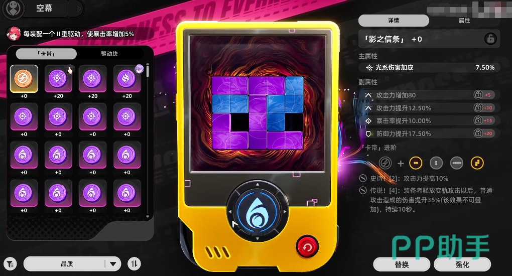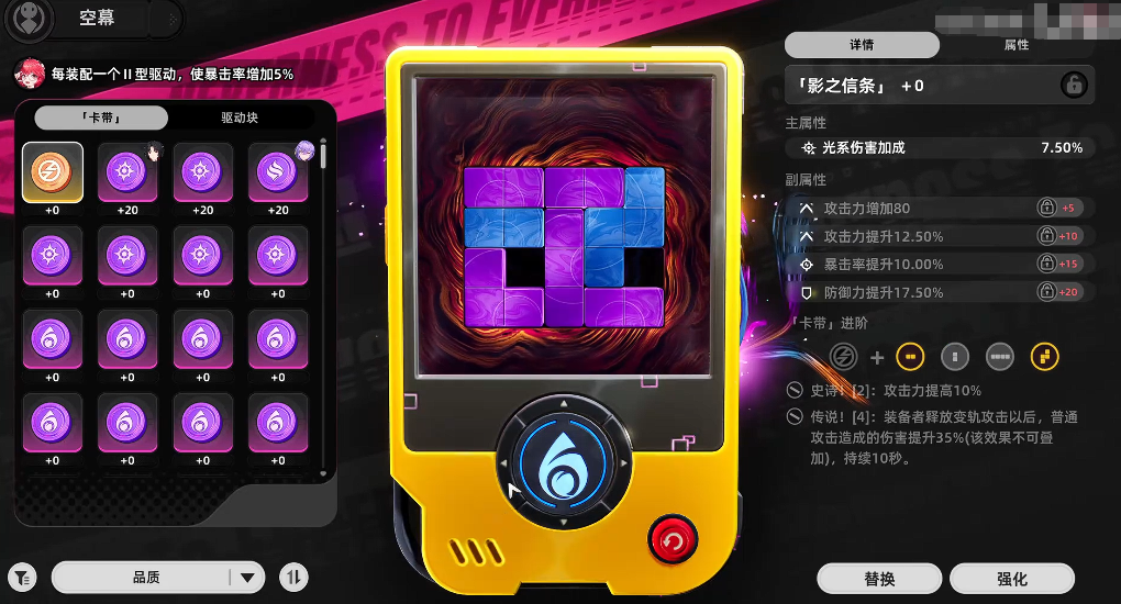 空幕系统以模块化卡带驱动为核心,采用类俄罗斯方块的网格布局呈现。玩家需根据角色定位,在空幕面板的可编辑槽位中放置卡带与驱动组件,并通过拖拽调整区块位置,以激活最优连携路径。该系统材料获取门槛较低,副本掉落、日常任务、活动兑换等多渠道均可稳定产出重复利用型资源。值得注意的是,所有突破类材料(含空幕升级、卡带升阶)均在此系统内消耗。建议优先集中资源培养主力输出或核心辅助角色,避免材料分散导致养成断层。