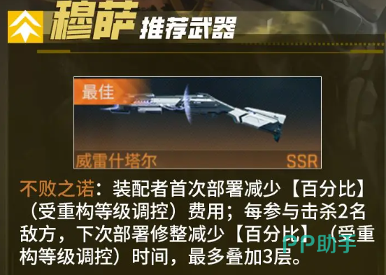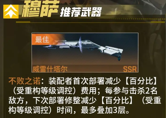 在装备选择上,威雷什塔尔无疑是首选武器。该武器的被动机制与穆萨的部署节奏高度契合,首次出场即可降低部署费用,具体减免比例随武器重构等级提升而增加,有效缓解开局压力。更关键的是,每当参与击杀两名敌人后,下一次部署的冷却时间便会缩短,最多可叠加三层效果。这一特性极大增强了角色的持续作战能力与机动性,使整体操作更加流畅。