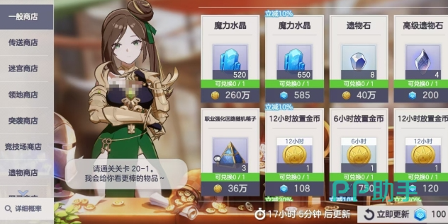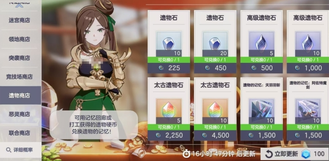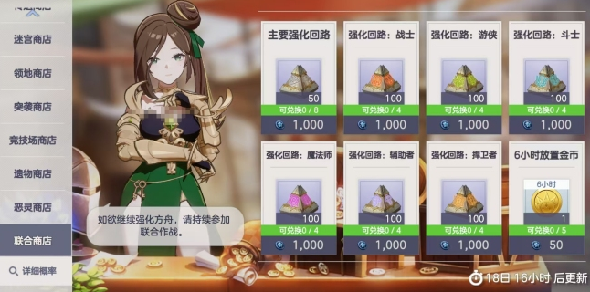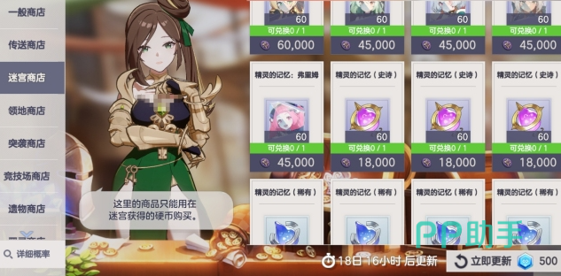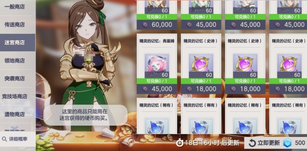 迷宫商店使用迷宫硬币,核心兑换逻辑为“定向补强优先”。指定史诗精灵记忆始终位列第一顺位,达成满额合成即止;剩余硬币可投入随机史诗精灵记忆抽取,其余道具因转化率过低,建议直接跳过。领地商店产出领地硬币量充足,无需囤积。首推永恒花与高级抽奖扭蛋,二者对角色成长曲线影响最为直接;完成上述兑换后,再按需补充领地建筑升级材料。