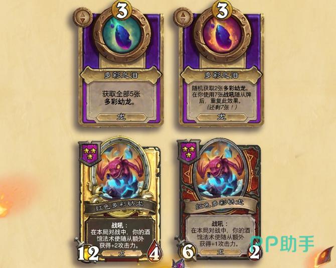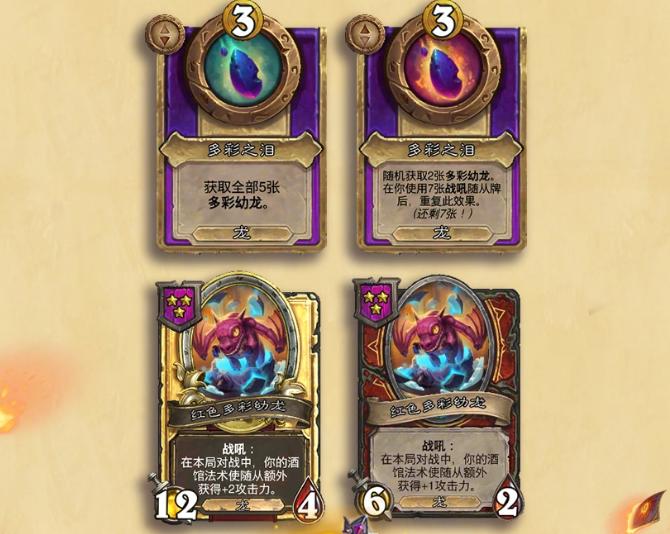 龙族分支引入“多彩幼龙”机制,功能定位接近现环境中的扩音机效果。共设5种差异化多彩幼龙,分别提供法术强度加成、攻击力与生命值双增、龙族专属攻血增幅,以及随机获得一张消耗2枚铸币的酒馆法术。相关协同饰品包括“多彩之泪”等,形成完整龙系成长闭环。