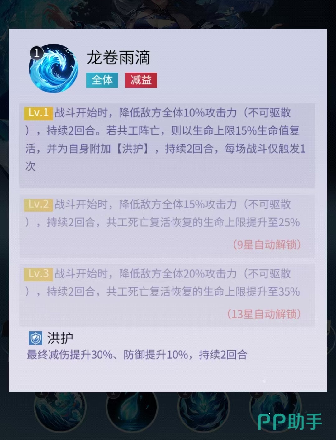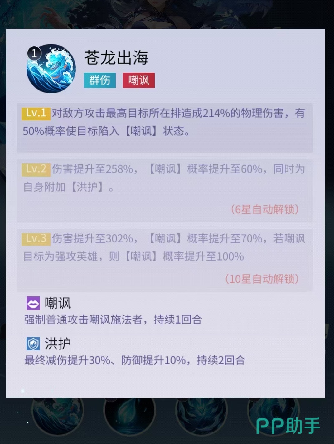 共工的核心怒气技具备精准打击与反制双重特性:锁定敌方攻击最高单位所在横排,发动大范围物理伤害,并有概率触发“嘲讽”效果,强制该排敌人优先攻击自身;同时为自己叠加“洪护”状态,显著提升最终减伤率与基础防御值。这一组合机制确保其在承受集火时仍能维持极高站桩稳定性。