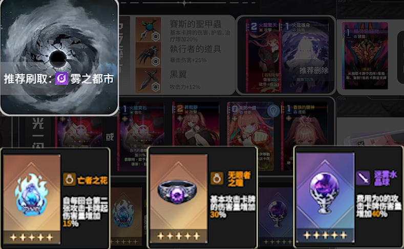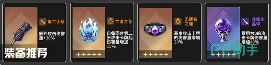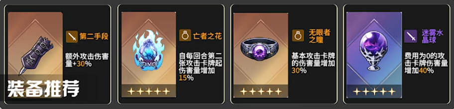 攻防一体本身应优先刷取“-1费”或“+1AP”的神之一闪效果,大幅优化循环流畅度。若队伍中配有鼠兔、火兔等热情属性协战角色,首推高叠乘灵光一闪;若仅梅玲单核驱动,则第二档选项更为稳妥。升龙脚灵光一闪未获多重攻击时,亦可依托大量攻防一体复制量,选用末位选项补足输出密度。装备方面,蓝色武器缺乏针对性加成,全程推荐橙色品质——其中迷雾水晶球为梅玲专属毕业装,王者之花与无言者之瞳则分别在攻击阶段提供高额增益与复制量联动加成,三者协同可最大化单回合总伤。