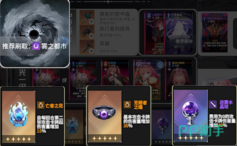 梅玲的核心输出逻辑围绕“攻防一体”卡牌展开:通过移动类效果复制该卡,实现单回合内多次0费普攻;随后以升龙脚收尾,触发多段额外攻击。需特别注意——仅由“移动”动作生成的攻防一体词条可参与复制并计入当回合攻击次数,而通过“抽取”获得的同类词条不生效。当前版本下,物之都市为最优刷取区域,因其专属掉落装备高度适配梅玲体系,包括王者之花、无言者之瞳、迷雾水晶球等关键橙装,均仅在此地图产出。