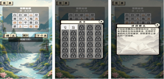 古诗词是我国文化瑰宝,此游戏是基于古诗词接龙或者填充的方式为核心,这里所涵盖的知识内容特别丰富,每个关卡开始之后都会给出不同的题目,玩家要根据具体的题目寻找到正确相应的文字,并填充在空白处即可完成闯关。闯关成功后还可以给出全面的解释,在每个关卡中还有提示的任务。尤其是很多小孩子可以通过边玩边学习的方式,掌握更多的古代诗词。
