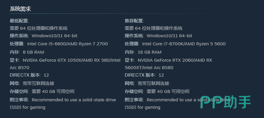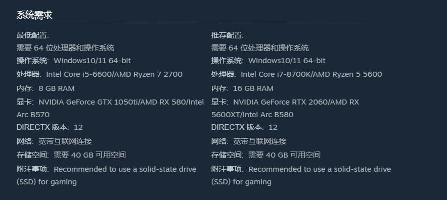 基础运行配置方面,官方推荐使用Windows 10操作系统;显卡最低要求为NVIDIA GTX 1050 Ti或AMD Radeon RX 560;存储空间建议预留至少40GB,该组合可在中低画质下保障稳定帧率,适合初次接触本作的新手用户。