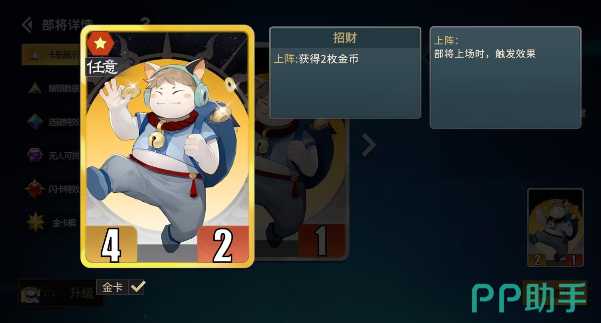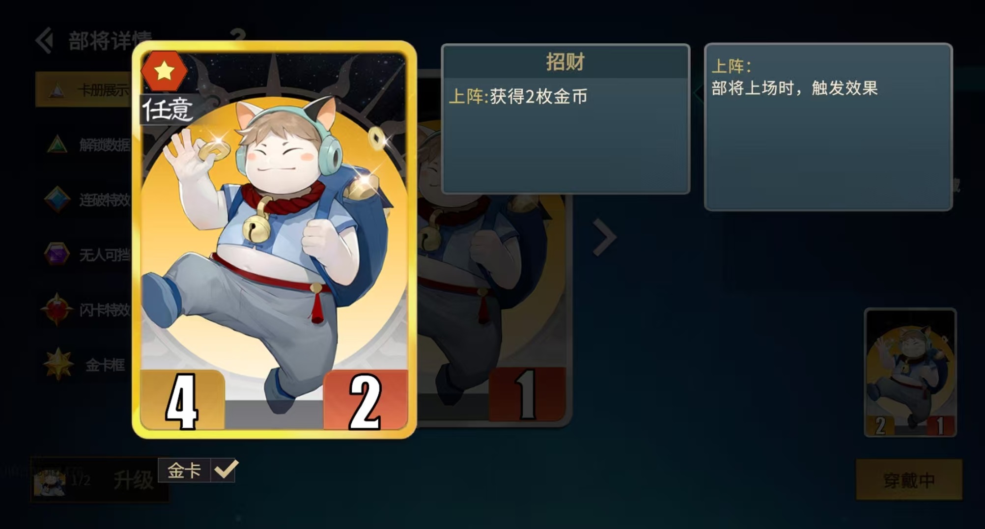 游戏内金币不产生利息,因此盲目存钱毫无意义。真正的经济优势来源于“精准收支”:一方面扩大稳定收入源,另一方面压缩非必要支出。基础回合收入随回合数线性增长,构成经济底座;而真正的增幅引擎来自三类模块——统帅技能、锦囊效果、阵营专属后勤与经济卡。例如招财金卡上阵即得2枚金币,若搭配青龙的上阵效果(收益翻倍),单卡即可贡献4枚金币;蜀阵营糜夫人提供2枚金币后勤加成,升为金卡后直接跃升至4枚;秦阵营吕不韦则在每次斩将成功后额外获得1枚金币。这些并非孤立加成,而是可叠加、可规划的持续性经济节点。