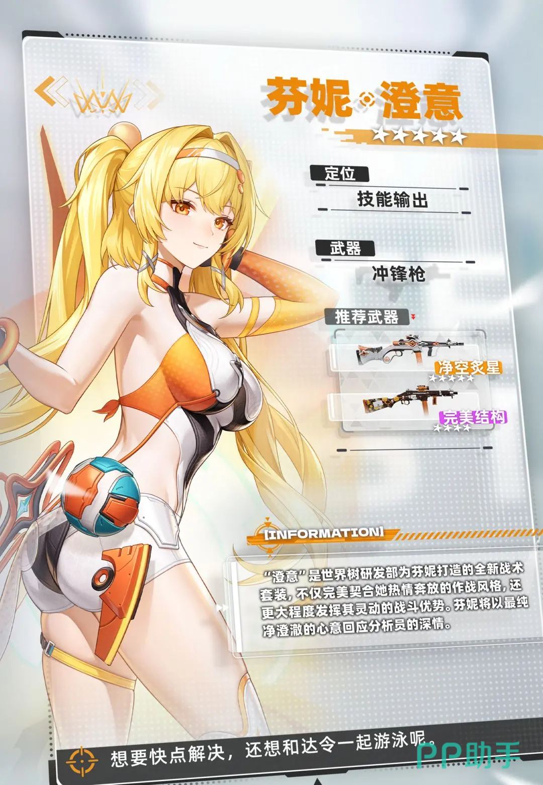 综上所述,尘白禁区芬妮澄意是一位以冲锋枪为主武器的高热伤害输出型角色,具备单体点杀与群体清场双重能力。其技能体系围绕“澄空”状态展开,操作灵活多变,适用于多种战斗场景,可根据实际战况灵活切换攻击方式,实现高效输出。