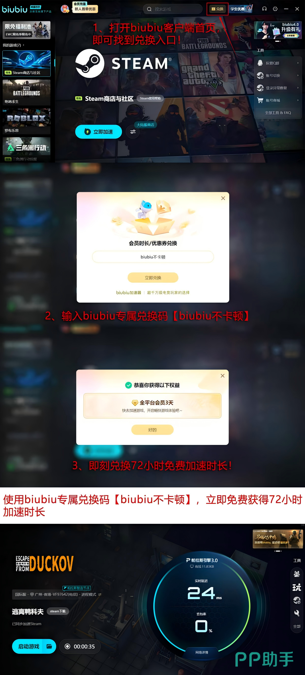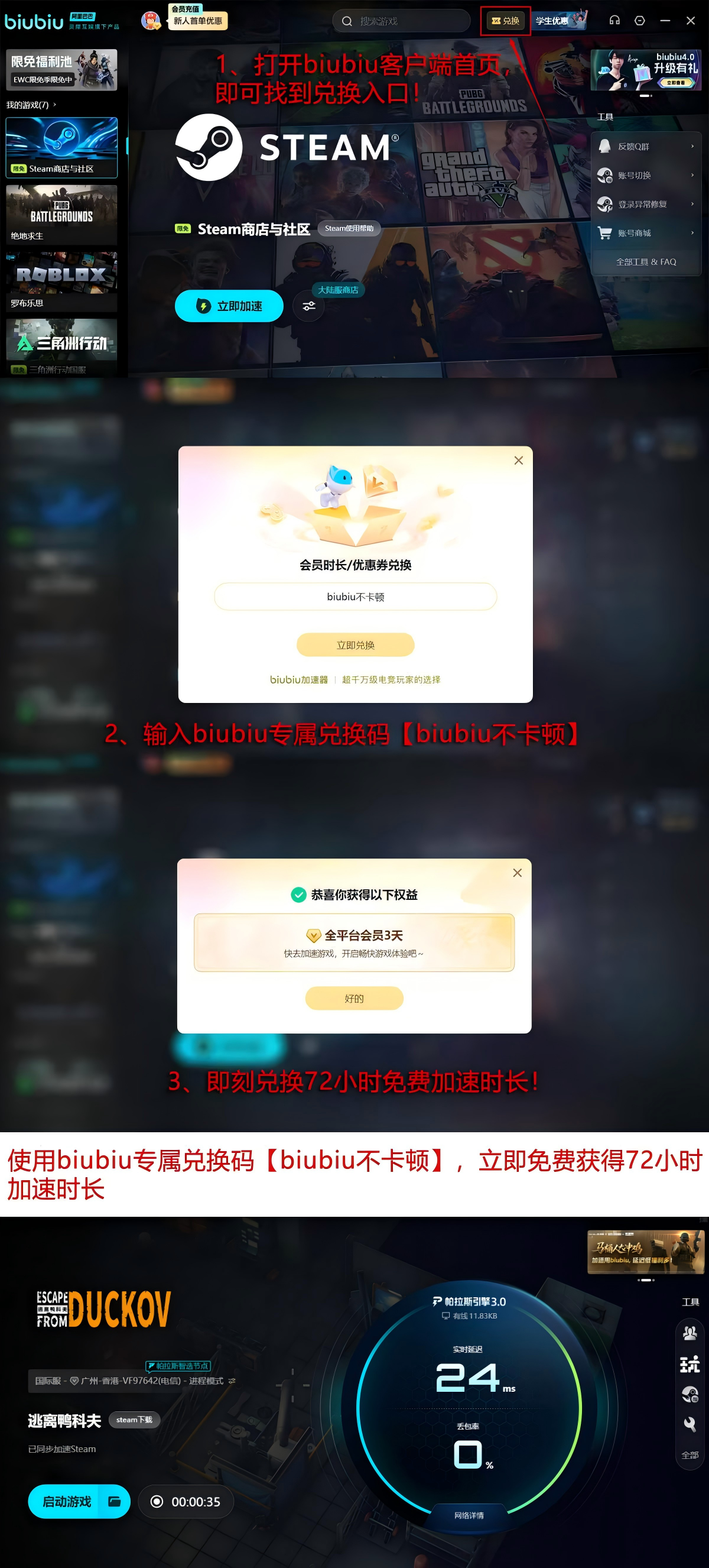 使用biubiu加速器还能享受丰富福利,尤其是新用户权益更为丰厚。注册登录后即可领取专属礼包,新人可先获得24小时免费加速时长,再输入口令【biubiu不卡顿】还可额外获赠72小时服务时间,总计可达96小时畅快体验。