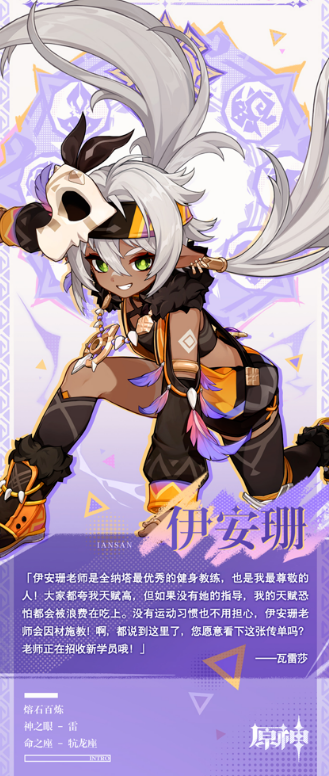 接下来说说伊安珊,她虽然是四星角色,但作为一名雷系长枪角色,她的存在感并不逊色于任何五星角色。伊安珊的定位非常明确,主要作为辅助角色,为队友提供攻击增益和回血能力。她的战技不仅能够突进,还能进入“夜魂状态”,此时她的普攻会得到增强。与瓦雷莎一样,伊安珊的长按战技也能够让她快速移动,增强机动性。而她的大招则可以为前台角色提供攻击加成,但要注意的是,这一增益效果需要前台角色不断移动来维持。伊安珊在团队中的作用不可小觑,尤其是她那一手攻击增伤和回血的技能,在队伍中起到了至关重要的支援作用。虽然她并不以直接输出为主,但她对队友的辅助和补给让她成为了许多队伍的关键一环。