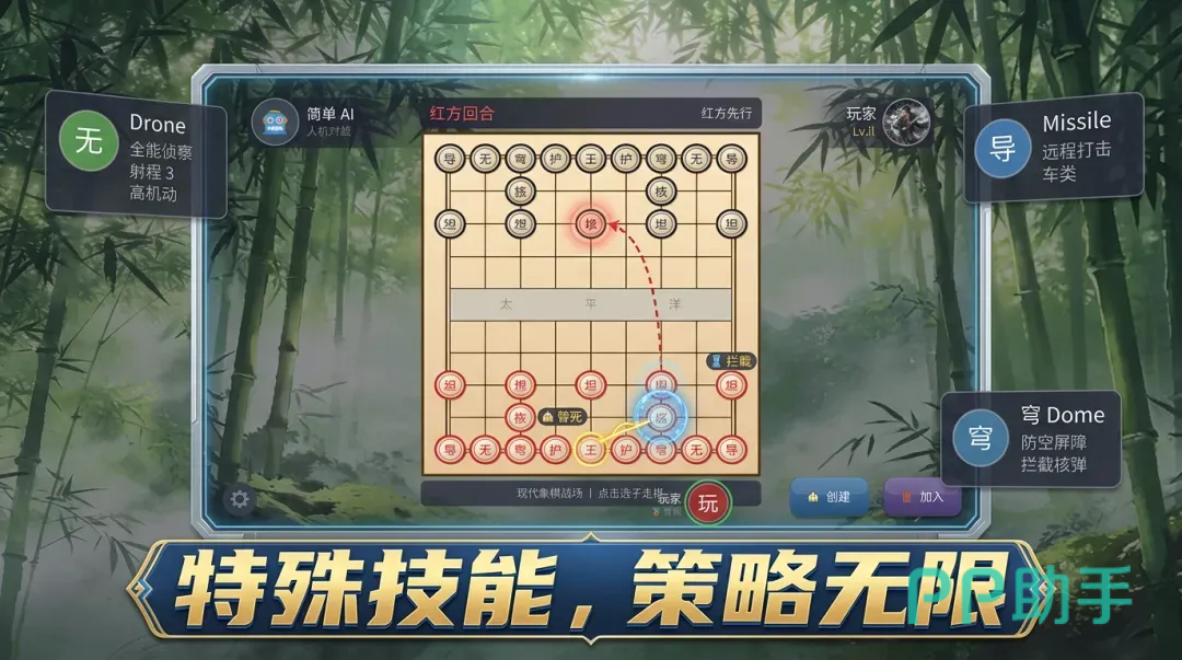 游戏核心机制仍严格遵循中国象棋基本行棋规范,但在此基础上拓展出多维策略维度——每位棋子均配备独立技能模组,激活后可临时强化移动范围、防御强度或攻击判定,并伴随专属视觉特效呈现,显著提升操作沉浸感与战局表现力。匹配系统采用智能随机机制,支持跨段位实时对战,确保每局博弈兼具公平性与不可预测性。