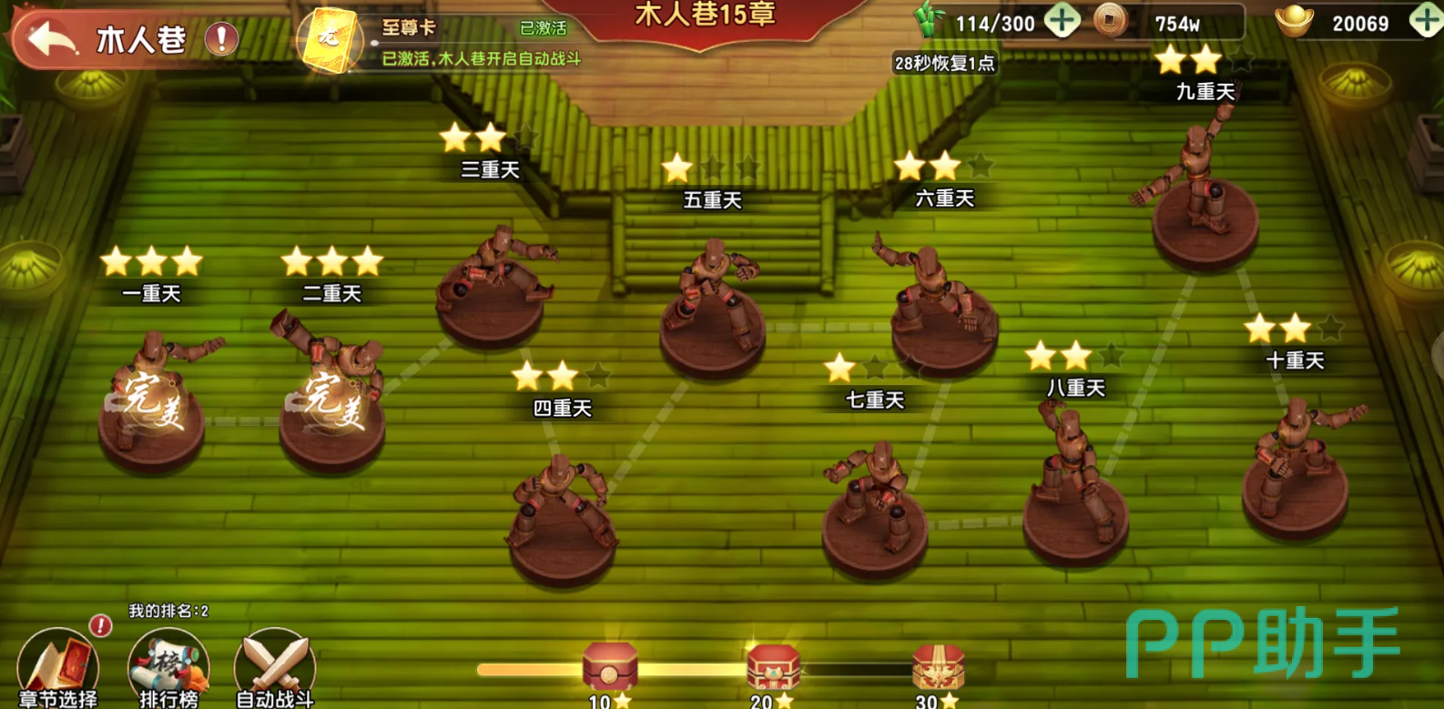 木人巷位于主界面“冒险”模块内,采用章节式结构设计:每章共10层,每层含10个独立关卡。单关最高可获三星评价,整层累计星数达10星、20星、30星时,分别激活对应档位的宝箱奖励。值得注意的是,通关逻辑为“一星即通”——任意关卡获得1星即可解锁本层后续关卡,并自动推进至下一层;而每完成10层(即1整章),方可开启下一章节内容,此时敌人强度、关卡机制与奖励品质均同步提升。