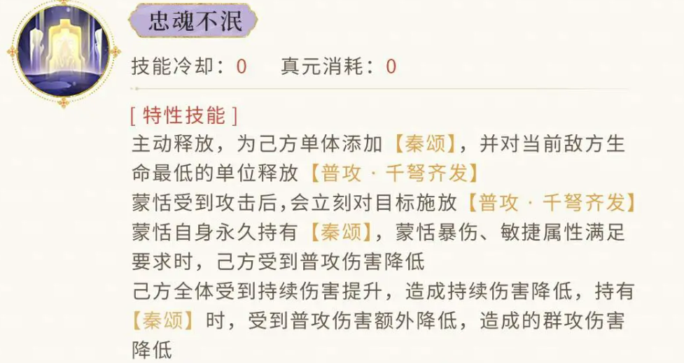 他的特性技能“忠魂不泯”是整套机制的核心。该技能不仅能主动为我方单位赋予“秦颂”状态,还能触发一次对敌方生命最低单位的普攻。当蒙恬受到攻击时,也会立即对目标发动一次普通攻击,使其具备一定的反击能力。此外,蒙恬自身常驻“秦颂”状态,具备较强的缴械免疫和伤害减免效果,使他在多种控制、爆发环境下依然具备稳定发挥空间。
