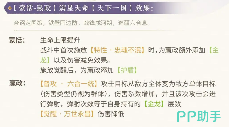 蒙恬的羁绊机制也极具战略深度。与赢政搭配时,首次使用“忠魂不泯”可为赢政添加“金龙”与伤害减免,且在释放觉醒技能时再为其附加护盾。而赢政普攻将由群体转为单体弹射型,并随“金龙”层数提升弹射次数,攻击力更集中,节奏也更加灵活。此类搭配适用于精准打击敌方核心的队伍。