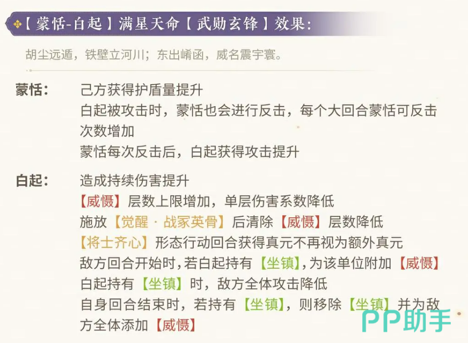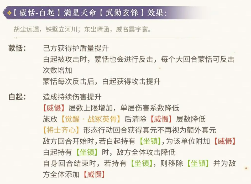 与白起的羁绊更偏重于连锁防御反击机制。白起受到攻击时,蒙恬会自动进行反击,每个大回合的反击次数还可提升。每次反击后白起将获得攻击提升,形成循环增效。此外,白起自身具备威慑机制,与蒙恬的反击形成互补,在防守中不断输出,压制敌方阵线。
