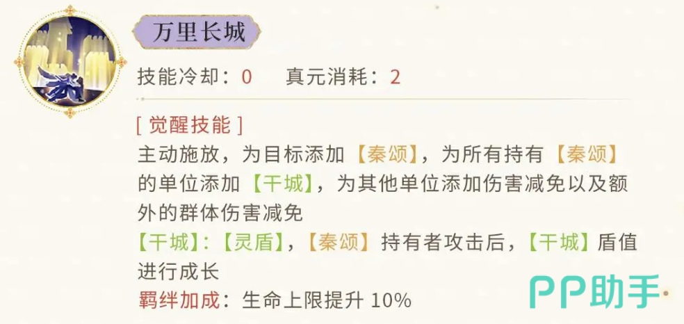 觉醒技能“万里长城”则强化了蒙恬的全局防御能力。技能释放后,不仅能为目标添加“秦颂”,还会使所有持有“秦颂”的单位获得“干城”状态,同时为其他队友提供群体减伤。值得一提的是,“干城”是一种具备成长机制的护盾,每次攻击后盾值会提升,使得阵容在战斗持续时间越长的情况下越趋于稳固。