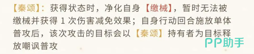 “秦颂”本身为一种多效状态:净化缴械、暂时免疫缴械、获得一次伤害减免,并在回合内使用普攻后使目标强制嘲讽该“秦颂”持有者。这一机制使得蒙恬不仅能在前排承伤,还能有效控制敌方攻击方向,为队伍中脆弱单位提供保护。对于依赖节奏掌控的阵容来说,这种机制尤为关键。