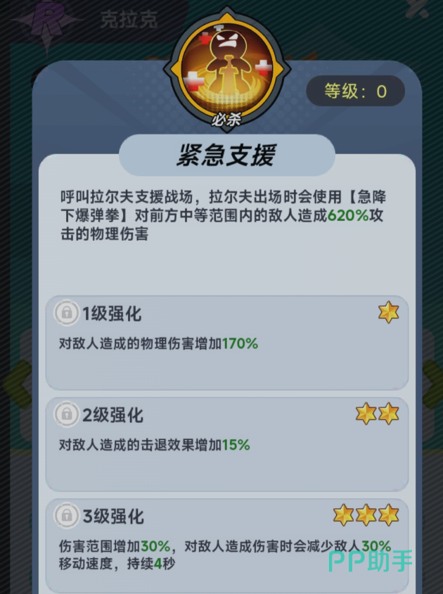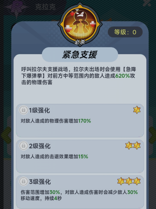 技能体系方面,克拉克以“投技大师”为核心标签,二技能【紧急支援】为关键控制链起点:释放后立即召唤拉尔夫入场,后者随即发动范围突进技,对前方扇形区域(覆盖角度90°、半径3.2格)内所有敌人造成245%攻击力的物理伤害,并附加1.5秒僵直效果。该联动机制兼具先手控场、打断衔接与群体压制三重功能,在BOSS战与竞技场对抗中具有极高战略优先级。