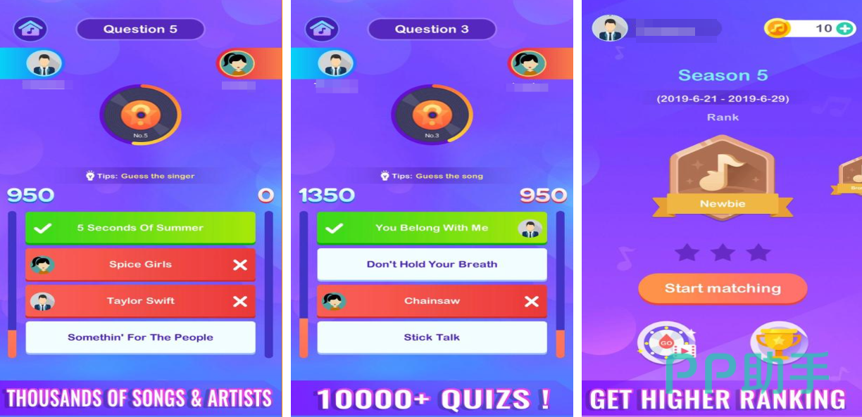 这款猜谜类的游戏主要玩法是与猜歌曲相关,玩家要聆听各种曲风的音乐然后选择合适的选项,选择正确后即可进入下一关继续听歌,沉浸式的音乐猜谜玩法无疑让音游粉丝着迷,古典音乐、欧美纯音乐等BGM加持都很动听,支持多人竞技让大家比拼下听歌猜曲的速度,在悦耳BGM中完成猜歌任务让大家感到满足,你也试着利用强大的听觉猜测歌曲吧。