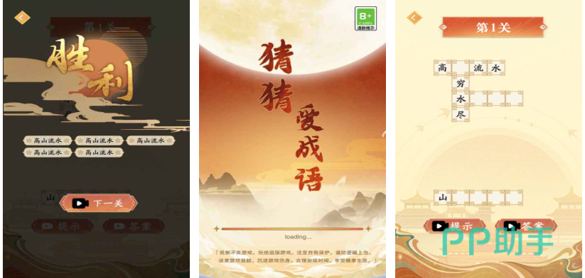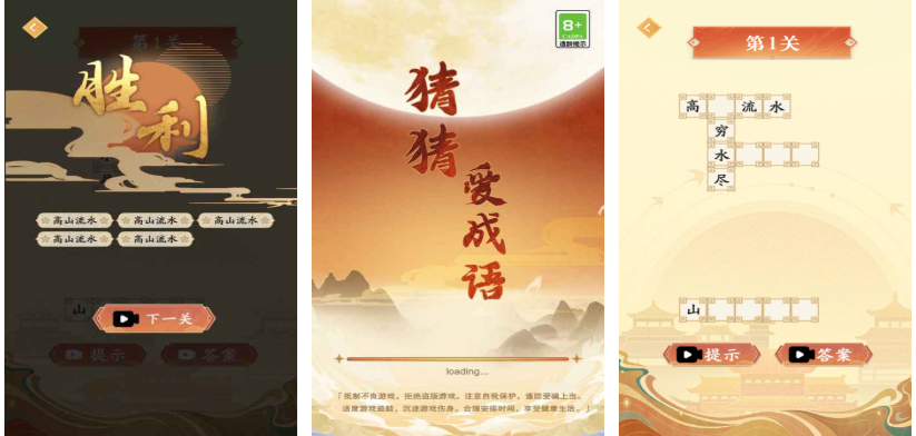 这款成语主题的猜猜游戏也会大大开发大家的智商,通过猜谜形式破解一些成语谜题可玩性更高,无数成语知识也会在猜谜关卡中呈现,古典音效配以古风背景也符合成语游戏设定,关卡后期难度会大大提升容易让大家上瘾,观看视频可以获取特殊的提示道具哦,如果实在难以通关就可看看视频找到破题关键。