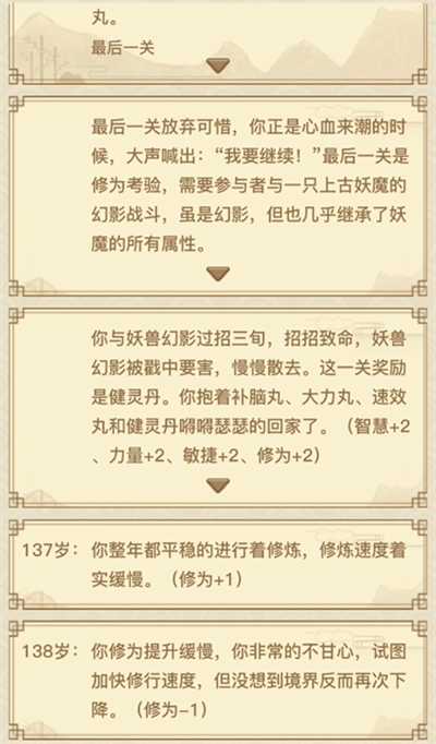 玩家还可以通过各种事件来增加修为,如河边箱子、莲花扇子、诡异花球等,每个选择都会对玩家的修为和属性产生影响。为了达到完美结局,玩家需要合理安排自己的天赋和修为。
